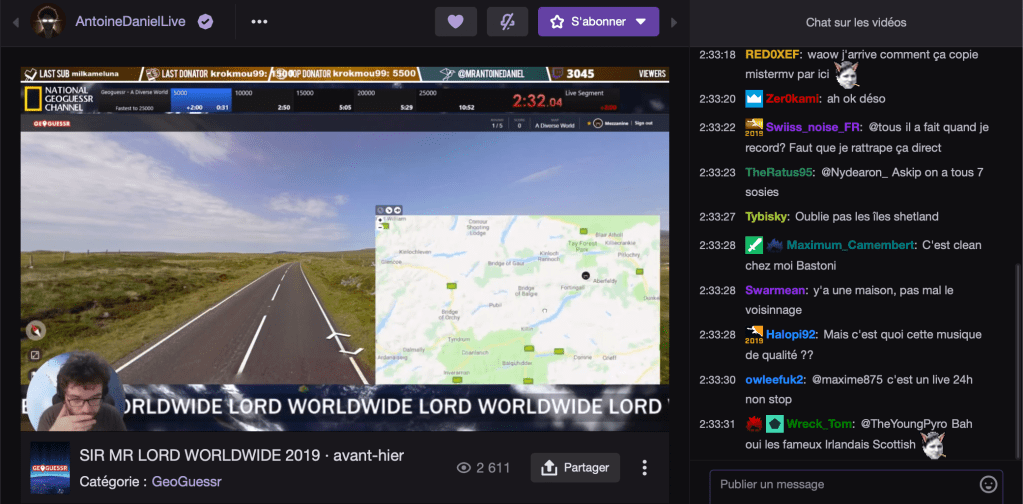 Ainsi, si vous avez déjà pu entendre parler de ce jeu sur Youtube, deux streamers assez connus ont fait des lives sur GeoGuessr : MisterMV, l’un des streamers francophones le plus connu et estimé mais, surtout, le célèbre YouTuber presque légendaire pour son émission What The Cut : Antoine Daniel. Et oui, si Antoine Daniel a laissé de côté Youtube, il est plutôt actif sur Twitch, passant beaucoup de temps à vouloir faire les 25000 points, soit une partie sans aucune erreur, le plus vite possible, le bougre ayant, pour l’instant, un record personnel de 10 minute et 52 secondes.