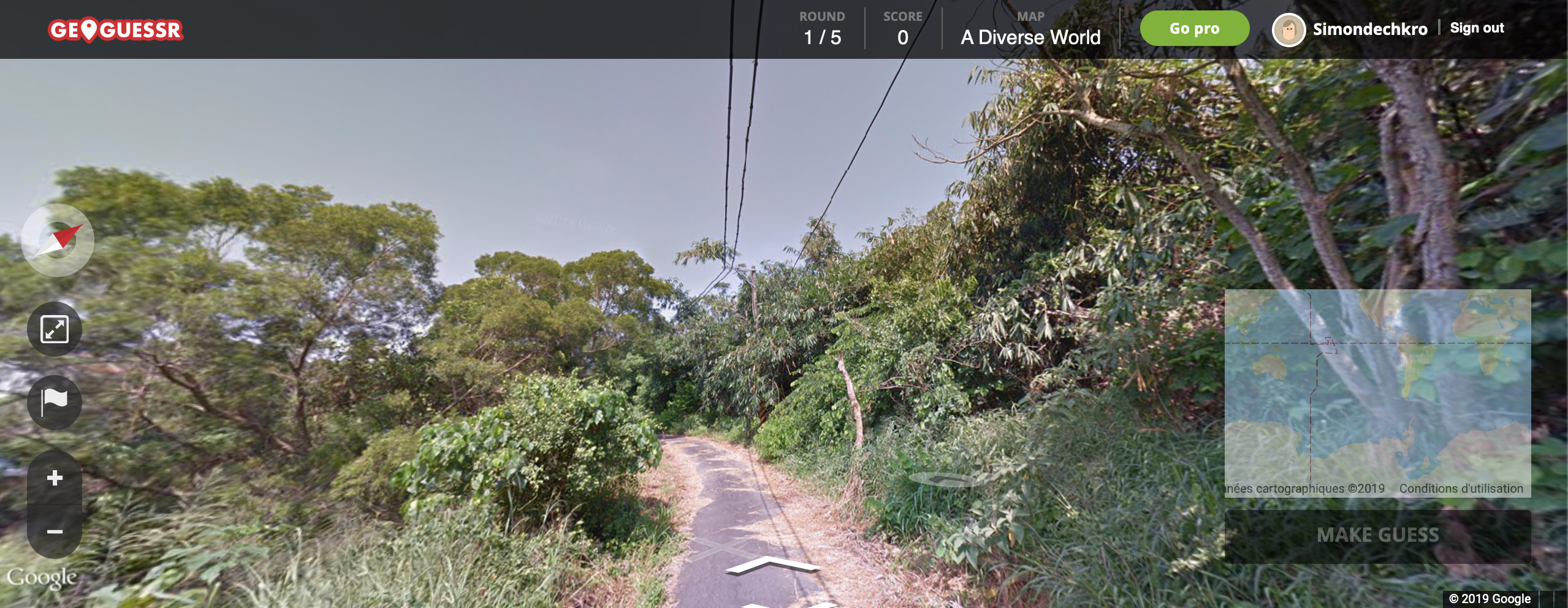 Après avoir passé un nombre incalculable d’heures sur des jeux du type Super Meat Boy, Trackmania ou Dragon Quest, je crois avoir enfin trouvé le jeu chronophage ultime, le jeu qui dépasse toute notion de difficulté, le jeu qui vous donne envie d’arrêter de jouer à force de ne pas y arriver : GeoGuessr. Cette abréviation de « Geographic Guesser », qu’une personne astucieuse pourrait traduire en « GéoEnigme », est particulièrement accessible, puisque l’on y joue directement depuis son navigateur internet. Le concept est très simple : le jeu vous transporte, via Google Street View, sur un point (plus ou moins) aléatoire de la planète, à vous de retrouver le plus précisément possible où vous êtes. La simplicité du concept alliée à l’immensité de la carte du monde disponible sur Street View fait que le jeu est en réalité sans fin. Évidemment, quand on apprécie la géographie comme moi, le jeu est assez délectable et l’expérience se transforme vite en un mélange de tourisme et d’exploration. Au fond, le jeu réalise virtuellement une sorte de fantasme de l’aventure moderne, revisitant « Rendez-vous en terre inconnue », devant un écran. Il y a donc une véritable excitation à se retrouver nulle part et n’importe où, au départ, tout en ayant en tête l’objectif du jeu. Cette excitation peut être assez puérile, rappelant l’appel à l’aventure de l’enfance, mais justement, GeoGuessr est en réalité très enfantin. Rien de plus enfantin qu’un outil détourné pour s’amuser, d’autant plus que le détournement se veut ludique : être perdu et devoir retrouver son chemin, on retrouve les angoisses et le besoin d’autonomie d’un enfant, qui nourrissent fondamentalement les contes. GeoGuessr se veut ainsi avant tout l’émergence de l’imaginaire dans la réalité la plus simple.