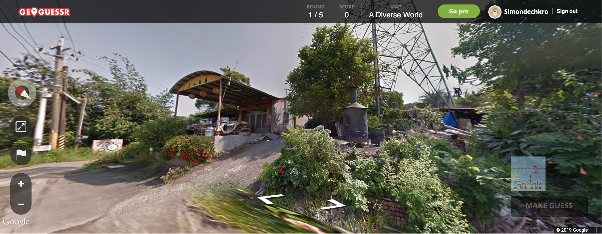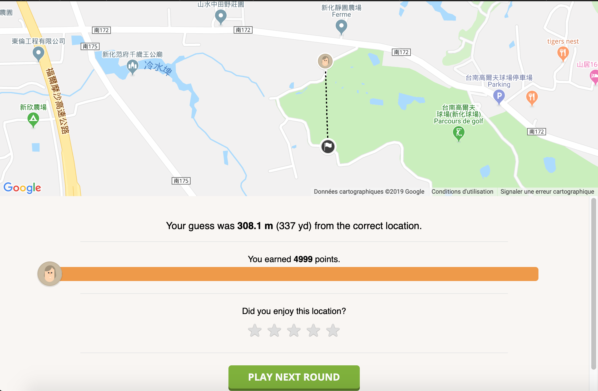 C’est sans doute ce qui est le plus impressionnant dans GeoGuessr : la pratique du jeu en tant que tel, le gameplay, rejoint des questions de pure connaissance. On pourrait alors se dire que le jeu refuse toute ignorance, puisque celle-ci rend impossible la victoire. Au contraire, et c’est ce qui participe à en faire un véritable jeu vidéo, GeoGuessr repose sur l’ignorance. Plus je joue, plus je visite de lieux, de pays, de villes et donc de cultures et plus je commence à saisir des constances. Plus je joue et plus j’apprends, par simple effet de logique, et plus j’apprends, plus je joue, afin de gagner de plus en plus de points. En effet, on gagne des points proportionnellement à la distance entre le lieu que l’on propose et le lieu réel où l’on se trouve, le maximum étant 5000 points si l’on se trouve dans un périmètre de 200m. Si l’on peut déjà jouer juste pour le challenge de retrouver où l’on est, gagner des points permet de véritablement créer une compétition, à tel point que du e-sport s’est développé sur le jeu et, encore mieux, du speedrun.