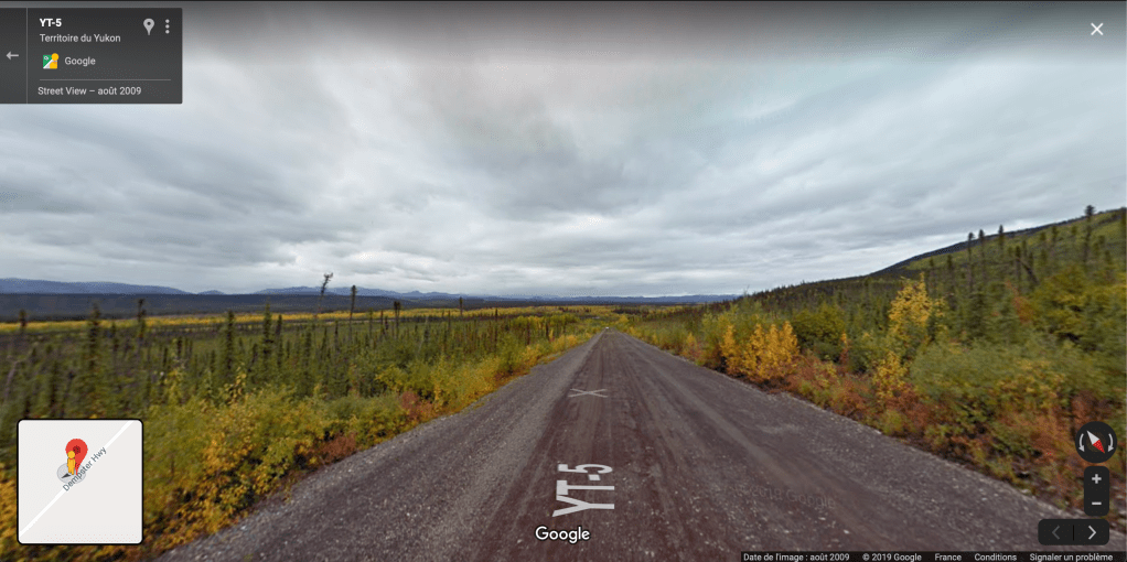 Si le jeu est si chronophage, c’est parce que l’objectif peut s’avérer très difficile à remplir. Une partie se joue en 5 rounds, il faut donc retrouver 5 lieux différents. J’ai eu pour ma part la malchance de tomber à de nombreuses reprises au milieu de très longues routes sans aucune intersections ni panneaux (le Canada, coucou). Dans ces cas là, la recherche se transforme presque en expérience métaphysique. Je traverse, comme si j’y étais, les montagnes du Yukon, accompagnant sur la route 5, peu après le Tombstone Territorial Park, la Google Car, dans un lieu où l’immensité naturelle se fait double. La nature, déjà grande par son étendue verticale, les montagnes, et son étendue horizontale, les forêts, les fleuves, les lacs, devient presque infinie après avoir cliqué des centaines de fois pour avancer cette voiture, sans jamais voir autre chose que ce paysage. L’effort du clic, dans un cadre de recherche, renforce la perte de repère. Evidemment, tomber dans un tel lieu est signe d’échec assuré (plus largement, tomber dans le nord du Canada pose de sérieuses difficultés), ce n’est donc pas le meilleur moyen de « jouer » ou plutôt de gagner. On peut ainsi, à l’inverse, tomber en pleine ville. Dans de tels cas, on observe mieux les ficelles du jeu à mesure que les réflexes émergent : de quel côté roulent les voitures, comment sont les panneaux de signalisations, quel est le système métrique utilisé, quel alphabet est utilisé, quelle langue est utilisée et suis-je capable de la reconnaître, pire encore, est-ce que je connais un minimum ce pays, ses villes, sa culture ?