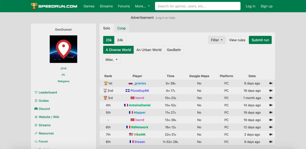 Si le jeu se veut long et plutôt immobile, il ne faut jamais oublier qu’un jeu dépend des personnes qui y jouent et des pratiques qui peuvent en émerger. C’est donc à l’opposer de cette immobilité que le speedrun, discipline qui cherche à terminer un jeu le plus vite possible, s’est développé sur GeoGuessr.
