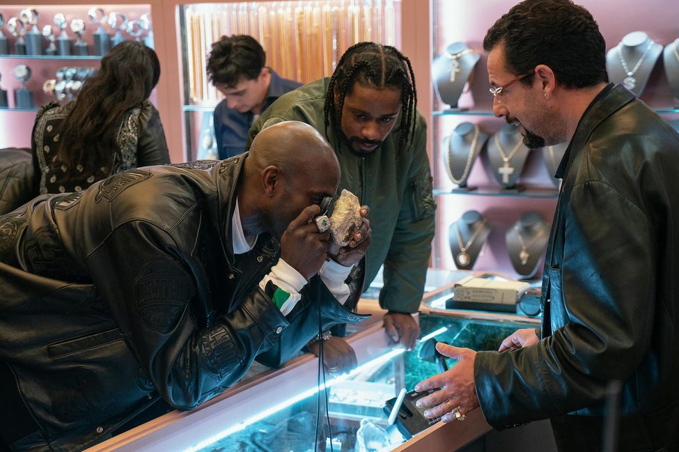 Trois fois non, car la vitalité de leur créativité ne s’embarrasse pas des redites, tant chaque mouvement est porté par une dépense. Là où Good Time jouait la carte du mélodrame, Uncut Gems épouse la farce sarcastique, autour d’une vulgaire pierre transitant de l’Afrique à New York, servant de catalyseur des pulsions les plus matérialistes de ses personnages. Car c’est bien une grande satire du fonctionnement capitaliste que nous joue les Safdie, ou comment la spéculation sur le rien (un tas de pierre ramené d’Afrique dont on pense qu’il coûte un million de dollars), va servir tour à tour de projection sociale (pour Ken K, basketteur bling-bling à la recherche de la plus grosse pierre), d’enrichissement personnel (pour Howard cherchant à multiplier son profit), jusqu’à tomber dans une forme de mysticisme absurde (ou comment on prête à une pierre, des vertus divines). On voit bien que le rachat affectif de Good Time a laissé place au rachat tout court, où la dépense trouve son terrain de jeu, non plus dans un geste compensatoire d’inadaptation complète au système, mais fait partie du fonctionnement de la société contemporaine.
