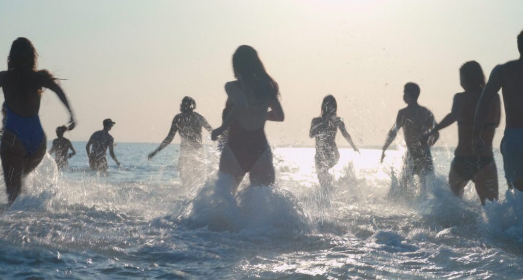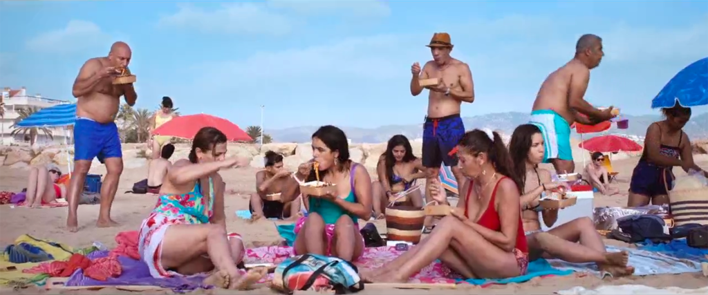 Dans Mektoub, les spaghetti à la sauce tomate ne répondent quasiment pas à cette fonction de symbole social — pour la simple raison que la différence de classe, ici, n’importe pas, rien ne laisse à penser que même un seul de ses personnages soit dans une situation précaire. Ici, les spaghetti sont réduits à leur plus simple expression, c’est-à-dire à une fonction utilitaire : se nourrir facilement et rapidement pendant une séance plage après que tous se soient épuisés pendant une baignade intense où quasiment l’intégralité des protagonistes du film, qu’ils soient de premier ou de second plan (une bonne quinzaine), aient joué ensemble dans une euphorie générale. Une scène de cinéma pur où son exaltation se reporte sur la séquence suivante du repas grâce la continuité musicale créée qui lie les deux scènes. Le « moment kechichien » type se rejoue : en partageant ces spaghetti à la sauce tomate, cette fois dans des contenants profonds en carton — sortes de semi-boîtes — et avec des fourchettes en plastique, on rit, on met sa fourchette dans la bouche d’un autre, on s’essuie la bouche mutuellement, etc. Certains ont une petite assiette, d’autres un plat très opulent qu’ils ont même agrémentés de fruits de mer. Comme toujours, on ne s’offusque pas de la simplicité ou de la répétition du repas, au contraire on prend le soin de commenter la qualité de sa préparation. « Momo, trop bonne tes pâtes ! », « juste un peu relevé. Excellent, vraiment bonnes ! ». Et, comme toujours, une fois toutes les remarques sur le repas apportées, la conversation peut commencer. On échange des ragots, ponctués de blagues, à propos de la nuit précédente en boîte de nuit. Il n’existe ici aucune fonction symbolique quelconque des spaghetti, absolument rien d’autre que la beauté de l’instant, de l’enjouement général. Chez Kechiche, documenter le groupe passe d’abord par la restitution de l’énergie qui s’en dégage.