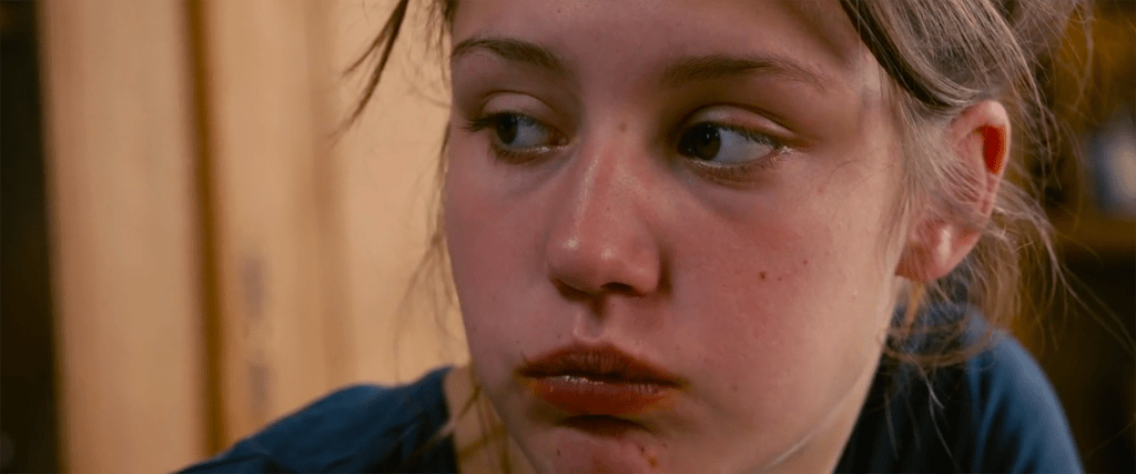 Dans le cours des dix premières minutes de La vie d’Adèle, Kechiche établit une scène de repas utile à présenter le quotidien d’Adèle, chez elle, avec ses parents. La séquence s’ouvre brutalement sur une succession de regards braqués sur le jeu télévisé que la caméra ne montre jamais, trop occupée à examiner les visages de ses personnages aux bouches barbouillées de sauce tomate. Sans détourner le regard, Adèle et ses parents mastiquent, lèchent leur couteau, s’essuient la bouche, lâchent un petit rot… Il ne débute jamais ne serait-ce que l’esquisse d’une conversation. Elle serait de toute façon très rapidement court-circuitée par la télévision. En revanche, on demande à se resservir, on précise la quantité voulue et on se réjouit de la qualité du repas. Puis, la scène s’achève sur un plan large qui révèle très brièvement et pour la première fois le décor : une salle à manger cheap et de mauvais goût. On pourrait considérer ici qu’il ne s’est rien passé et pourtant on en sait déjà bien plus long sur la condition de cette famille qu’un dialogue ou une péripétie n’aurait pu en révéler.