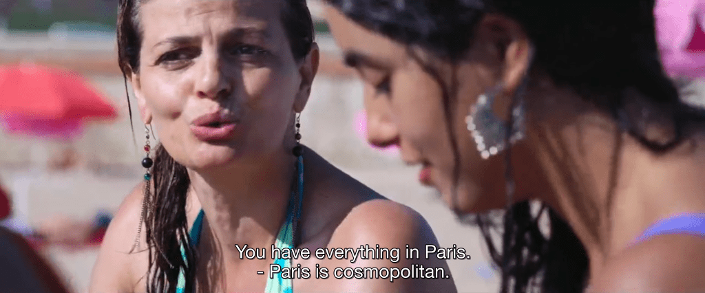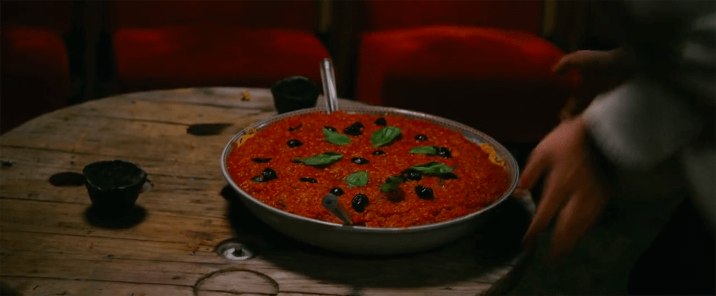 La majorité des scènes de Mektoub se déroule dans et autour du restaurant tunisien des mères respectives de Tony et Amin, à Sète. Charlotte et Céline, toutes deux françaises en vacances, sont invitées au restaurant et par là immergées dans la culture maghrébine où on se questionne sur la formulation arabe de « je t’aime », on danse sur du raï, la famille proche est le centre des conversations et des fréquentations, on vante les plats traditionnels et, de manière générale, on joue, toujours avec dérision et humour, sur ses propres stéréotypes culturels. Et, pourtant, ce repas sur la plage — alors qu’il pourrait très vraisemblablement provenir du restaurant tunisien — n’est absolument pas traditionnel. À la place, voici une dizaine de franco-maghrébins et quelques français qui partagent un plat italien. Pourquoi ne pas avoir plutôt placé un plat traditionnel maghrébin ? Parce que ce que Kechiche cherche ici, c’est d’abord à exploiter la fonction sociale du repas — cette pratique si méditerranéenne utile à réunir ses proches — et non sa fonction culturelle. En faisant le choix des spaghetti à la sauce tomate, Kechiche exprime mieux la convivialité que s’il avait fait le choix d’un plat maghrébin moins connu de tous. Ce plat, dont l’universalité a fini par le déconnecter de son pays d’origine, est donc beaucoup plus apte à restituer l’énergie pure du collectif qu’un plat traditionnel appartenant à une culture bien déterminée.