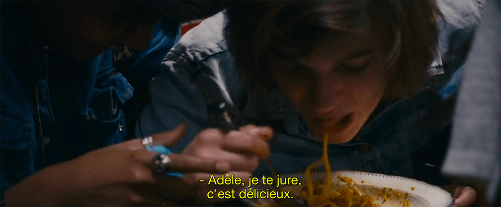 Mais, à l’instar d’une grande tragédie classique, l’amour est plus fort que tout et ce cloisonnement de classe entre fruits de mer et spaghetti à la sauce tomate n’arrête pas la romance d’Emma et d’Adèle. Au contraire, les deux jeunes filles surpassent les obstacles et mènent à bien leur histoire d’amour. À travers leur parcours, Kechiche explore tout un lot de situations où les différents milieux se mêlent et complexifie cette allégorie de classe sociale dont les spaghetti à la sauce tomate sont le motif. Parmi l’une des situations, Kechiche développe une scène d’une ingéniosité redoutable : lors de l’exposition des peintures d’Emma dont Adèle est le modèle, la jeune lycéenne comble son incapacité manifeste à rejoindre les conversations intellos en servant (et on imagine préalablement en préparant) un large plat de pâtes à la sauce tomate pour toutes et tous. Adèle alimente les conversations. Elle en fournit le support, favorisant donc l’évènement social d’une classe qui, inconsciemment, l’exclut. Et alors, c’est un moment kechichien qui s’ouvre : tout le monde accourt et se réunit, présentant son assiette et soudainement l’action ne tourne plus qu’autour des spaghetti à la sauce tomate. « Je veux bien de la sauce », « Tu peux m’en mettre plus s’il te plaît ? », « Y a du parmesan ou pas ? », « Ça va ça pique pas trop ? », « C’est un verre de terre qui sort de spaghetti et qui dit : « Ouf, quelle partouze ». On joue avec les pâtes, les glissant dans sa bouche avant de les aspirer, les plaçant dans la bouche d’un autre, piquant dans une assiette qui n’est pas la sienne… À la suite de ce service s’ouvre alors toute une situation qui vient enrichir le motif. Adèle est largement remerciée pour son plat et elle n’est désormais plus exclue de l’évènement puisque les spaghetti ont été l’élément qui l’a ralliée à cette classe cultivée. Pour autant, les discussions intellos ne s’interrompent pas pour elle mais Adèle est néanmoins abordée et trouve quelqu’un avec qui discuter agréablement et sur des sujets qui lui sont accessibles. Les spaghetti à la sauce tomate, figure du cloisonnement social d’Adèle, deviennent ici la raison même du décloisonnement mais d’un décloisonnement seulement partiel. C’est dans cette ambivalence que réside toute la complexité des frontières poreuses entre classes si chère à Kechiche.