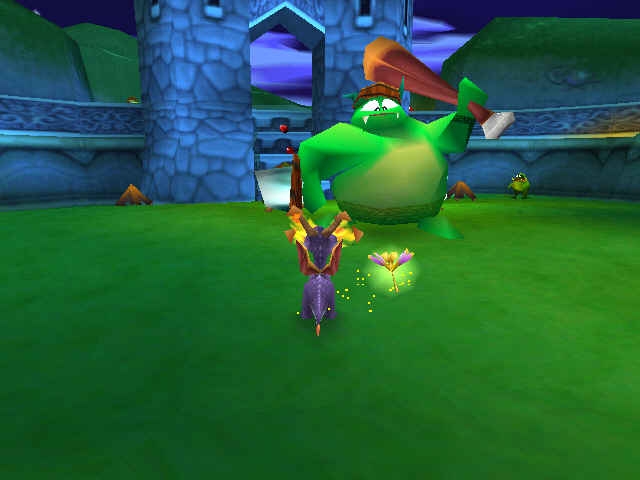 Pour accompagner cette technologie, adieu les flous qui dissimulent l’horizon et qui se soulèvent quand on s’en approche. Toute la carte est visible lorsque Spyro plane, ce qui était encore une révolution technologique : une visibilité infinie tout en conservant les détails de près. Le réglage de la caméra automatique a été compliqué pour les équipes, celle-ci avait tendance à tourner en rond autour du personnage sans se stabiliser, de quoi donner le tournis. Mais ils sont parvenus à la calibrer très vite : on ne retrouve aucune trace de ces problèmes, même dans le premier jeu. Enfin, qui dit endroits cachés, dit gemme. Car comme on l’a dit, les dragons adorent les joyaux. Pour pouvoir trouver ces précieux cailloux et leurs cachettes, il fallait pouvoir deviner leur emplacement. C’est pourquoi le scintillement de la gemme est visible de partout, que ce soit au sol ou en vol. Même si le joyau n’a pas la taille d’un pixel à l’écran, son petit éclat peut être vu de n’importe où sur la carte.