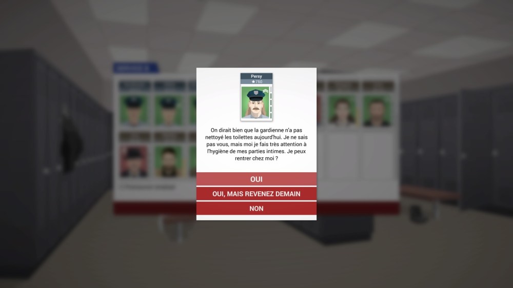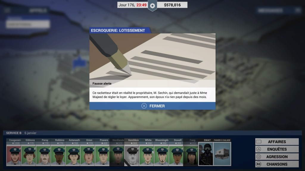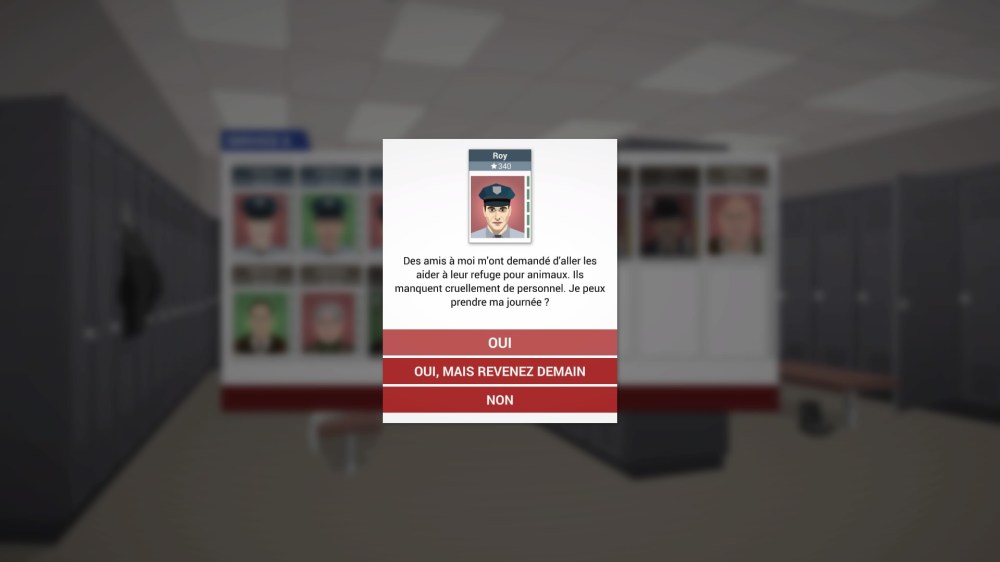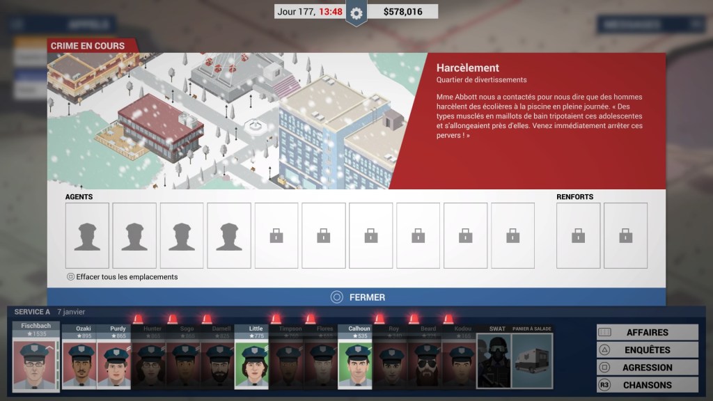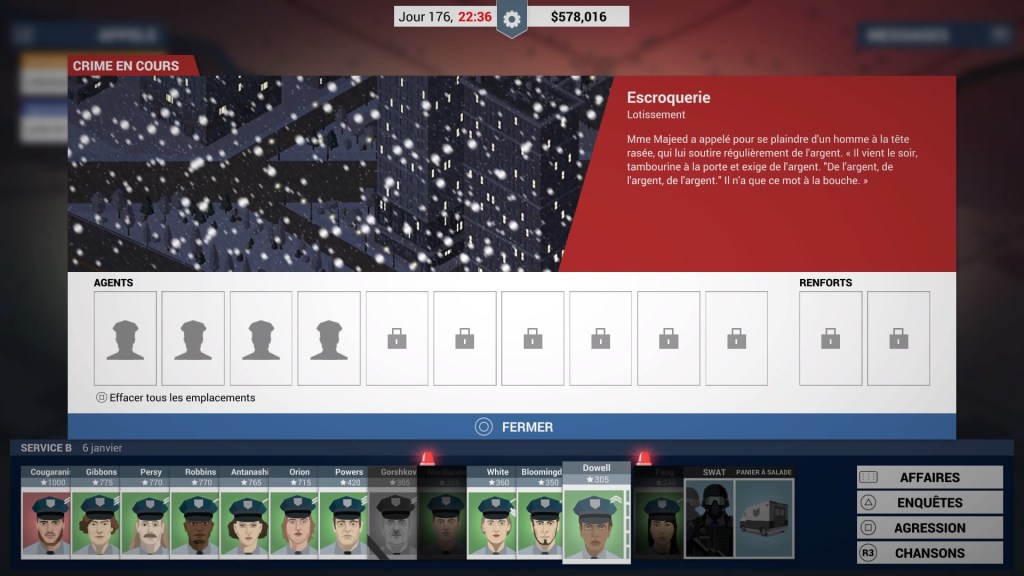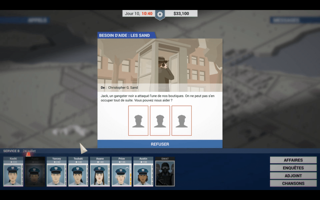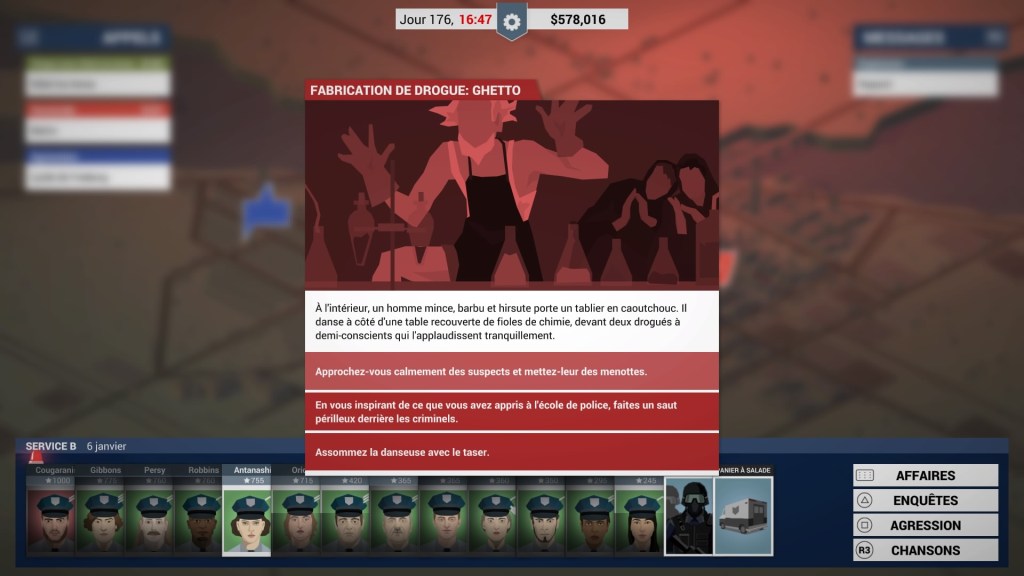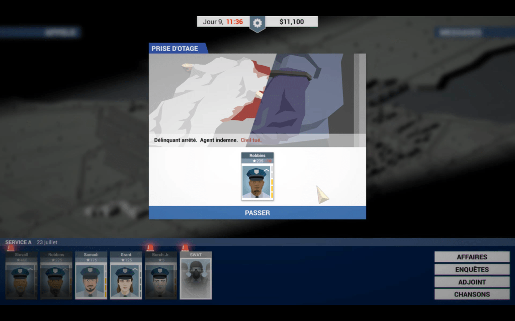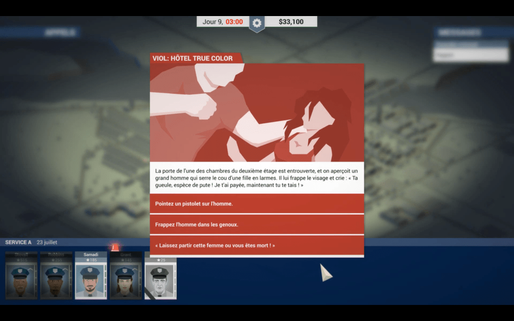 Malgré tout, et ce fut mon cas, j’ai appris par un indic que certains officiers complotaient contre moi. Pas de chance pour eux, par le plus grand des hasard, je les ai envoyés sur une intervention qui leur a couté la vie. Dans le même ordre d’idée, le jeu propose, pour s’enrichir, de ne pas déclarer le décès de certains officiers, afin de récupérer leur salaire. Paradoxalement, et c’est ce qui est intéressant, si le jeu nous pousse à un comportement littéralement criminel, on comprend aussi rapidement que les choix en interventions doivent privilégier le dialogue et l’apaisement plutôt que la violence. Ainsi, sur certaines interventions, il nous faut choisir l’action des agents sur place, action qui dépend aussi du niveau de compétence des agents.