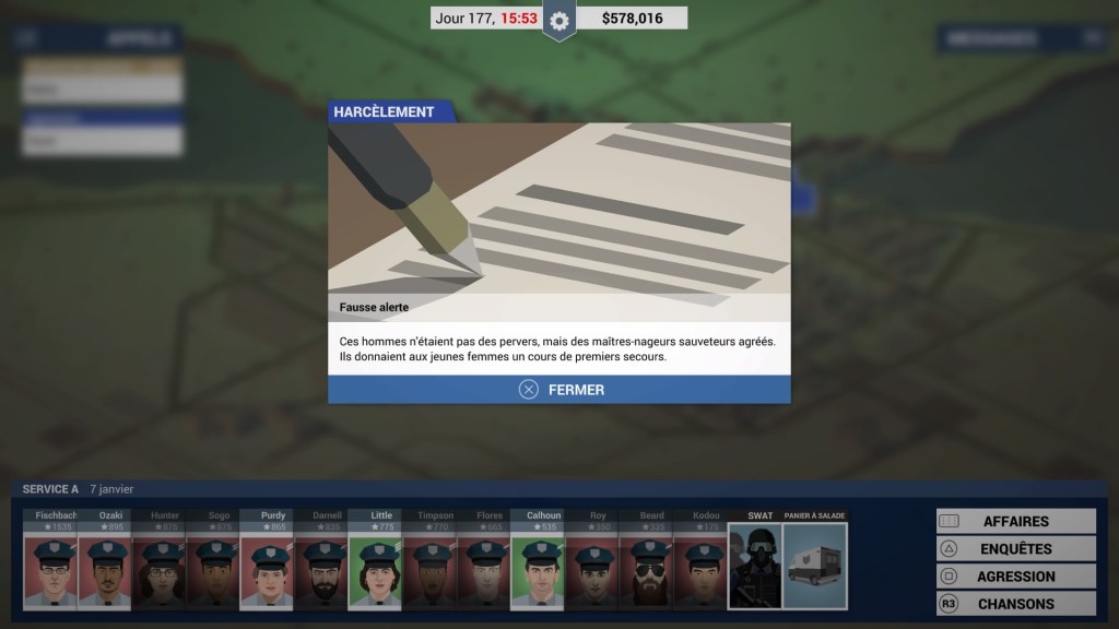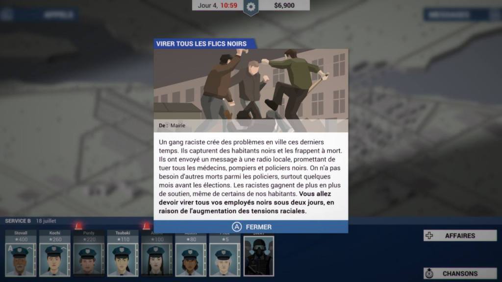 Si le jeu n’est parfois pas subtil, il faut quand même souvent faire attention et mener l’opération dans une logique de désescalade, qui permet d’arrêter les personnes en faute tout en assurant la sécurité de tout le monde (pas comme en vrai, en fait). En somme, le jeu punit les flics qui se prennent pour des cowboys (pas comme en vrai, en fait). Ceci dit, malgré cela et ma position personnelle sur les violences policières, qui influence ma manière de jouer, j’ai quand même été amené quelque fois à taser des personnes. Pourquoi ? Soit c’était parce que le jeu ne me proposait pas d’autres choix, soit c’était parce que je ne voulais pas prendre de risque lors de situations dangereuses. De manière réaliste, quand on a beaucoup d’agents compétents, non seulement on peut s’occuper de tous les signalements mais on peut le faire bien. Réciproquement, moins on a d’agents compétents, plus on cherche à gérer chaque affaire rapidement avec le minimum de risques possibles. Avec efficacité, le jeu fait surgir la complexité du fonctionnement de la police et, plus précisément, du mécanisme des violences policières. Le manque d’effectifs et la fatigue des équipes que cela implique, ainsi que la pression de la mairie mais aussi l’urgence de certaines situations, tout cela peut vite devenir explosif.