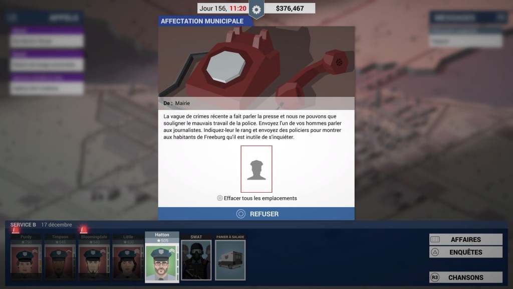 Mais alors, pourquoi ne pas avoir plus d’effectif ? Le jeu se voulant réaliste, on fait évidemment face à des enjeux budgétaires. Si l’on arrive à satisfaire la mairie, on peut demander un poste supplémentaire, soit côté police soit côté détective, une amélioration du SWAT pour les grosses opérations ou, n’oublions pas nos intérêts, une augmentation de salaire. Malheureusement, le jeu tâche d’installer un cercle vicieux : Peu d’effectif = Opérations ratées = Mairie mécontente = Baisse budgétaire = Moins d’effectif et ainsi de suite. Satisfaire la mairie ne consiste pas seulement à bien faire son travail et la distinction est cruciale. En ce sens, plus le jeu avance, plus un propos politique se renforce. Au début, la mairie peut demander de réprimer une manifestation par la violence, arbitrairement. S’il est tout à fait possible d’encadrer la manifestation pacifiquement sans qu’il n’y ait de débordement, la mairie ne sera pourtant pas satisfaite.