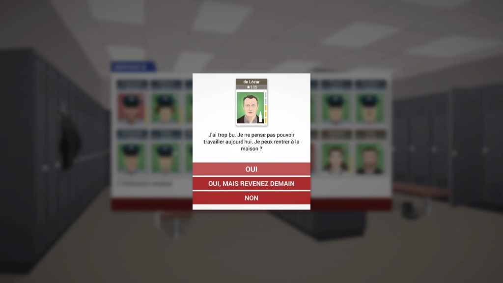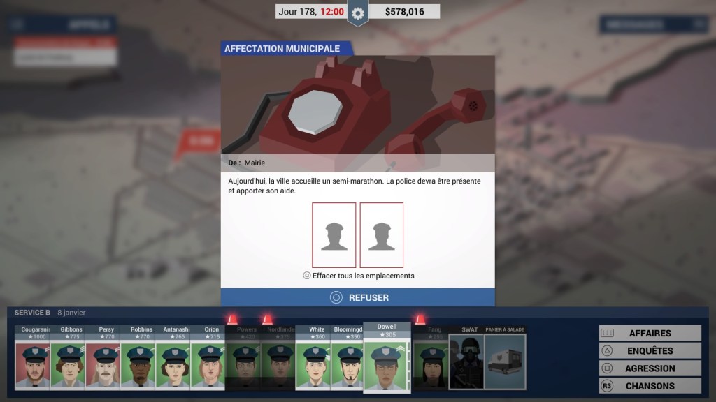 Si le principe d’un jeu de gestion reste assez classique, le transposer dans un commissariat permet au jeu de développer certaines réflexions. Tout d’abord, en quoi consiste vraiment la gestion ? En tant que chef de la police, on doit d’abord s’occuper de nos effectifs, leur niveau de compétence, leur état de fatigue, leurs inquiétudes et, lors de la fin du jeu, en pleine campagne électorale, leurs opinions politiques. Il y a ensuite la phase active, qui consiste à recevoir des appels d’urgence pour décider qui et combien de personnes on envoie sur place. C’est la deuxième étape de la gestion d’effectifs puisqu’il faut réussir à intervenir pour chaque délit, chaque crime. La tâche peut s’avérer laborieuse au début, faute de moyens suffisants. Avec le temps, une certaine maîtrise se développe mais le jeu réussit à empêcher toute lassitude de s’installer. Par exemple, un bar va ouvrir en ville, offrant des réductions pour les membres de la police. Il faudra donc s’adapter en fonction des personnes qui viendront travailler avec la gueule de bois et pourront se tuer alors qu’ils se rendent sur une intervention. De même, lors d’une vague d’attaques contre la police, il faudra toujours envoyer les patrouilles à deux minimum, ce qui divise drastiquement la capacité d’intervention.