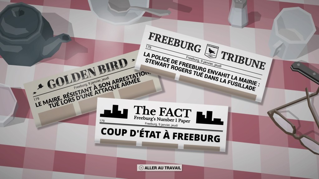 Sorti en 2016, This Is the Police est à la croisée du jeu de gestion et du jeu narratif, à choix, avec une esthétique proche de la bande dessinée et du dessin animé. Vous incarnez Jack Boyd, chef de la police de Freeburg, stéréotype d’une ville des Etats-Unis, et vous allez devoir tout faire pour que ses 180 jours avant la retraite se passent au mieux, avec le (faux) objectif de réunir 500 000$.