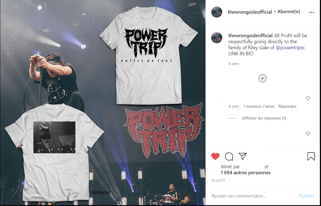 Un beau mouvement s’empare alors des réseaux sociaux : tout le monde poste des photos, des vidéos, des liens. Le monde du thrash metal s’unit pour rendre hommage à Riley, pour célébrer tout ce qu’il a pu accomplir de son vivant, pour le remercier de nous avoir offert sa musique. Des T-shirts sont même réalisés, dans le but d’offrir les bénéfices récoltés à la famille du chanteur (et, oui, j’ai craqué, non je ne l’ai pas encore reçu, stay tuned comme on dit).
