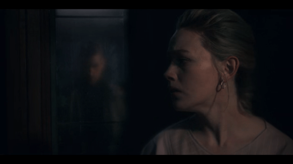Or, le choix fait par Flanagan, dans The Haunting of Bly Manor, ne prolonge pas cette singularité qui faisait la grande qualité des deux oeuvres précédentes, opérant alors un changement radical. Lors de l’épisode 2, “L’élève”, Miles et Flora proposent à Dani de jouer à cache-cache dans le manoir, à la nuit tombée. Nous le savons, cette séquence est inspirée de l’une des plus célèbres des Innocents. D’ailleurs, réalisateur comme scénariste – Cyaran Foy et James Flanagan – ne s’en cachent pas, allant jusqu’à reproduire à l’identique un plan, iconique et terrifiant, du film de Jack Clayton : dans le dos de Danie, depuis le fond du champ, l’apparition lente mais terriblement certaine du visage de Peter Quint. L’effet de mise en scène – l’émergence progressive d’un corps derrière une surface opaque, la vitre embuée – fonctionne toujours autant, car c’est bien cette opacité qui nous conforte sur la possibilité de non-existence de cette silhouette, cette formulation du et si ? Toutefois, la fin de l’épisode renverse cette ambiguïté : Danie n’est plus la seule à voir Peter Quint, Miles le voit également, comme l’indiquent clairement les derniers champs contrechamps.