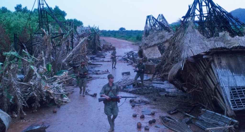 Si le jeune lieutenant Onoda est envoyé sur l’île de Lubang, au coeur des Philippines, alors que le Japon ne cesse d’essuyer les défaites, c’est – du moins, ce sont les indications qu’il accepte de donner dans un premier temps – pour y mettre en place les prémices d’une grande opération de guérilla. Cependant, cette action inaugurale est vite anéantie par l’arrivée des troupes américaines, lesquelles mettent rapidement en déroute l’armée japonaise. Des premières, quasiment rien n’est montré. En pleine nuit, Onoda, placé au sommet d’une colline, observe la flotte américaine bombarder un port – fugace et mémorable vision apocalyptique. Plus tard, alors qu’il traverse discrètement avec ses hommes un village dévasté par les bombardements et les flammes, des soldats (américains?) surgissent de la végétation environnante. S’engage alors une courte séquence de fusillade au cours de laquelle les adversaires apparaissent aussi furtivement qu’ils disparaissent. C’est parce qu’ils ne sont, au fond, que des images spectrales, à l’instar de ce croiseur observé (encore une fois) par Onoda, disparaissant dans la brume de l’horizon, tel un vaisseau fantôme.