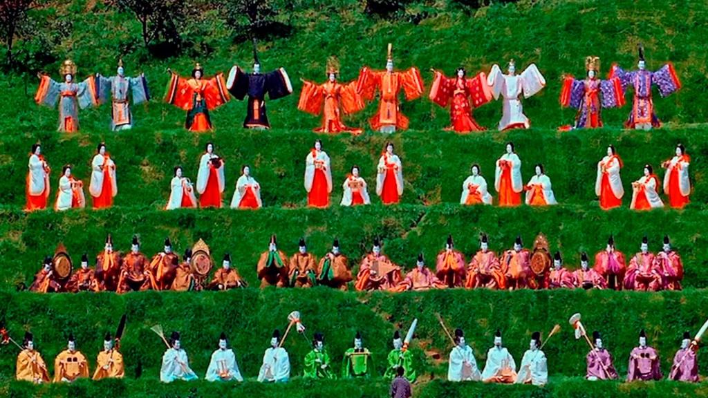 Par ailleurs, d’autres arts traditionnels japonais sont présents dans l’esthétique du film, à commencer par le Théâtre No. Ce théâtre aristocratique et religieux était composé de chroniques récitées en vers et rythmé de danses traditionnelles en costumes, avec une forte gestualité, et une parole semi-chantée et accompagnée d’un petit orchestre. On retrouve donc dans le film l’importance des masques et de la musicalité avec, en complément à Chopin également très présent, des percussions traditionnelles, des vocalises, flûtes, et autres sonorisations particulières et polyphoniques.