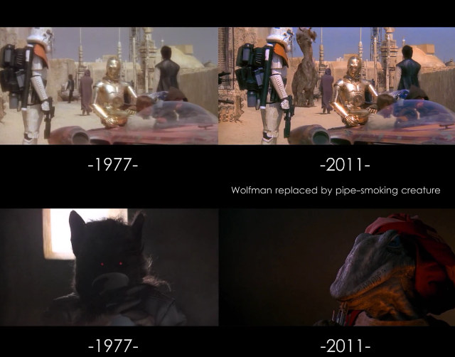 Pour quitter le cadre des plateformes et du format télévisuel, prenons l’exemple de films bien connus et qui ont subi le même phénomène : La guerre des étoiles (1977) de George Lucas et E-T L’extraterrestre (1982) de Steven Spielberg. Les copies d’origine de ces deux films ne sont quasiment plus disponibles, ayant été substituées par leur version « restaurée » (dans ce cas de figure l’intention des cinéastes est aussi mise en cause). Mais cette remastérisation, loin de rendre grâce à leur état d’origine, est un processus d’addition de couches : nouvelle image 4K + nouveau son Dolby Surround + nouveaux effets visuels en numérique (comme l’est la démultiplication des clones et d’extraterrestres chez Lucas, l’effacement des armes chez Spielberg, ou bien la correction des textures, et l’ajout d’éléments visuels absents originellement). Le trucage et l’effet spécial matériel sont substitués par la tromperie du numérique, sorte de travestissement d’une image par une autre – l’une matérialisée sur pellicule, l’autre dotée d’une muabilité falsificatrice – laissant néanmoins toujours transparaître les traces de ce voile frauduleux.