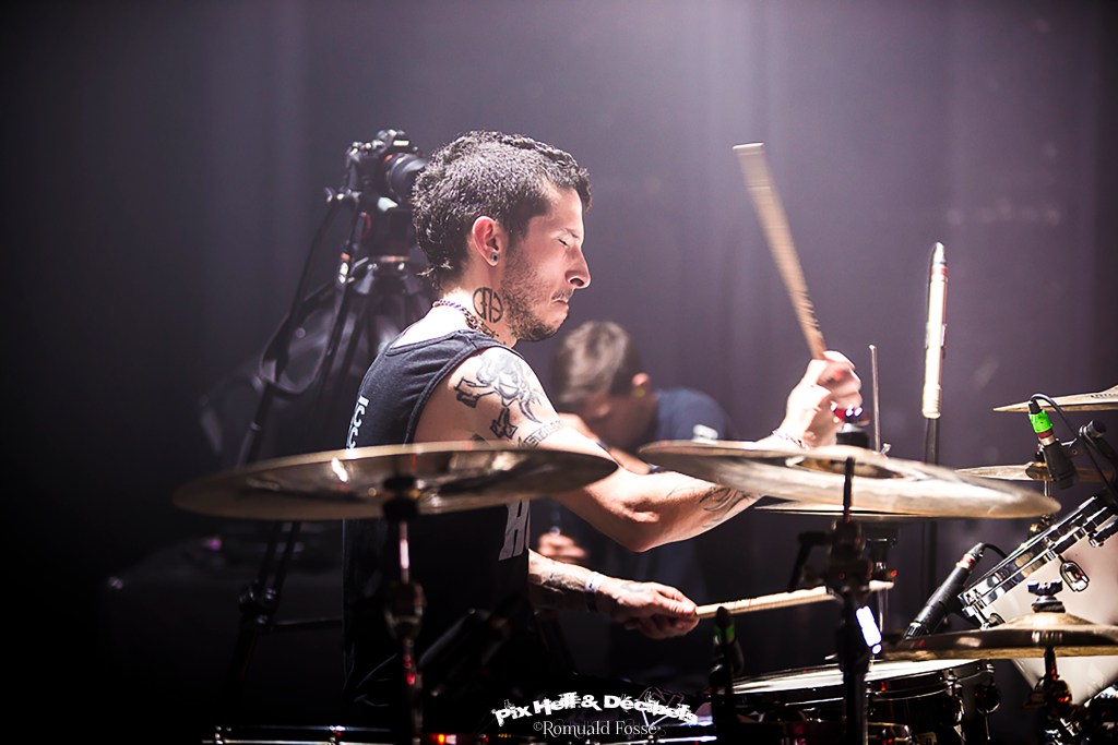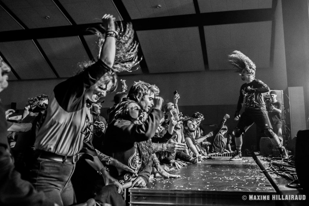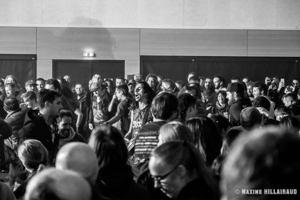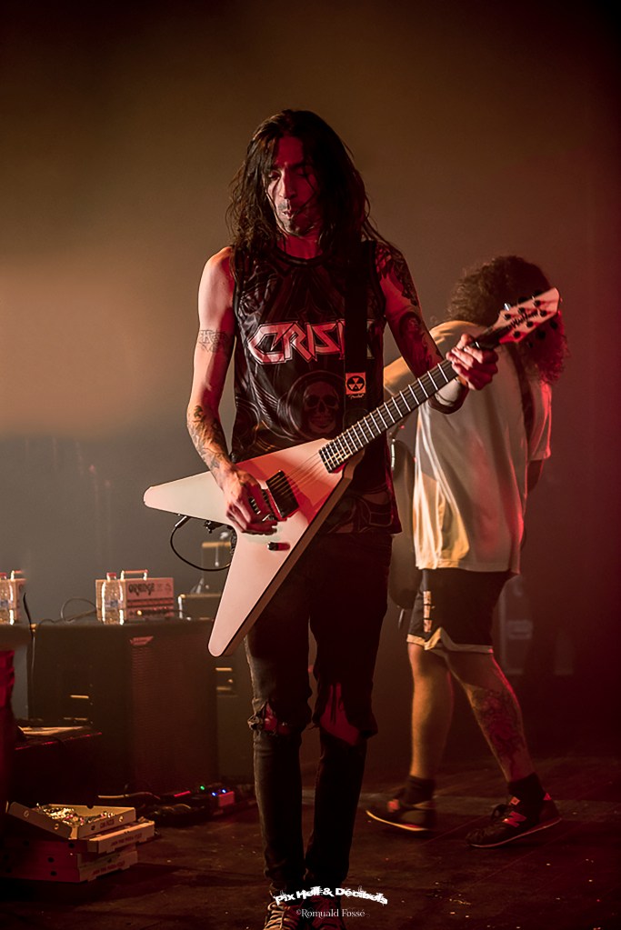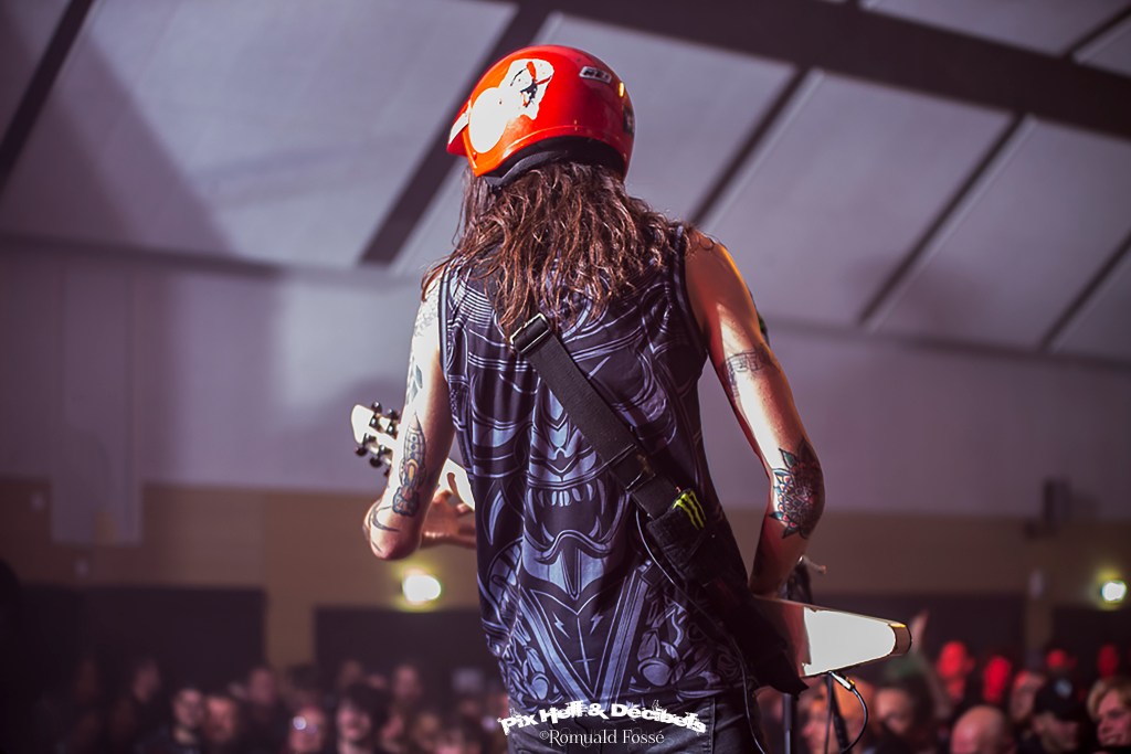 Les cinq membres sont rapidement arrivés sur scène : un coup de balai, pour nettoyer les confettis et autres babioles d’Insanity Alert, et les balances étaient lancées. D’ailleurs, selon moi, leur rapidité a légèrement déstabilisé le public. En effet, lors de leur arrivée sur scène, la salle était timide, il aura fallu la descente dans la fosse du guitariste, Busi B. Plaza, pour que l’ambiance monte.