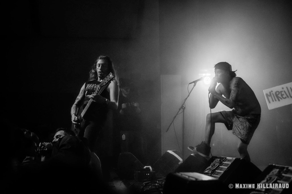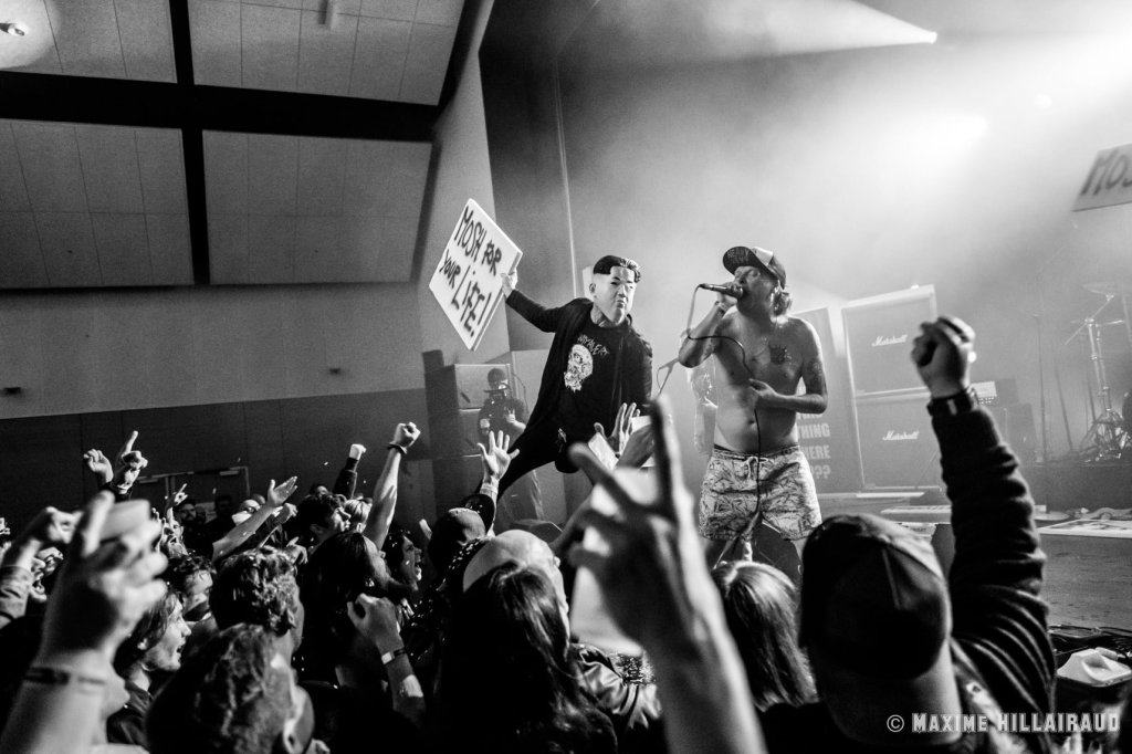 Les deux premiers groupes relevaient du punk hardcore et étaient bien sympathiques malgré la salle un peu timide. Nous noterons plusieurs messages envers les communautés oppressées. Malheureusement, je n’ai pas pu assister au concert de Dirty Fonzy, ayant passé six heures en train, je comptais bien manger un bout. C’était sans compter sur l’attente… Eh oui, si je devais trouver un défaut à l’organisation du festival, je dirais que le temps d’attente au stand de snacking, qui proposait pourtant des galettes et crêpes, était extrêmement long, résultats des courses : nous n’avons pas pu manger par peur de louper le début d’Insanity Alert, je ne voulais pas manquer à mon habitude d’être présente au premier rang !
