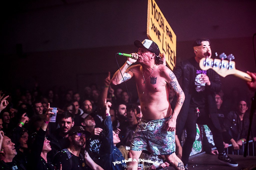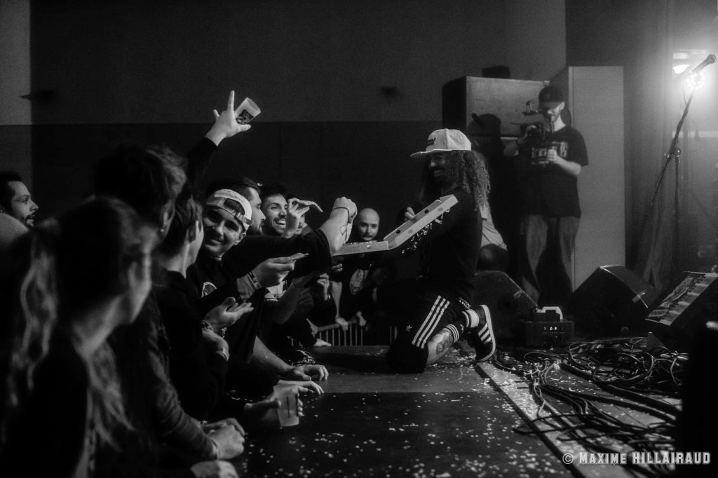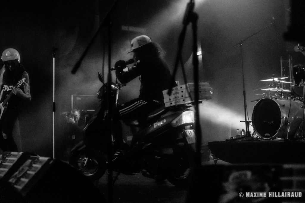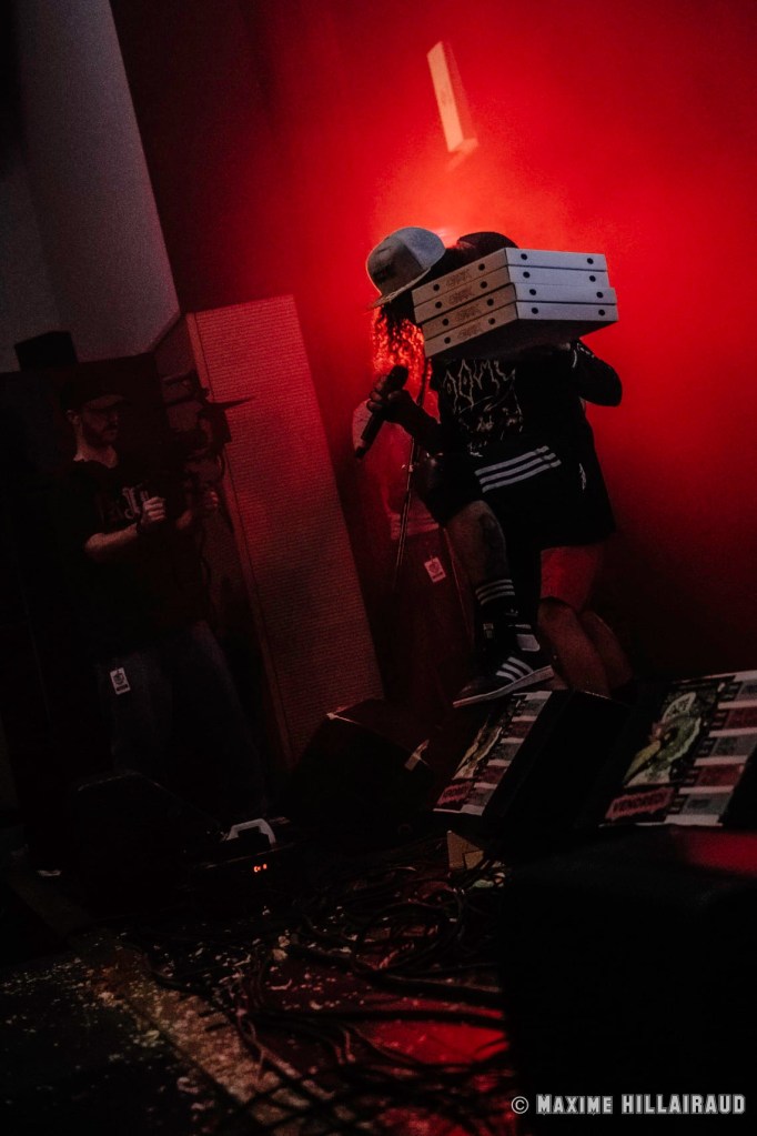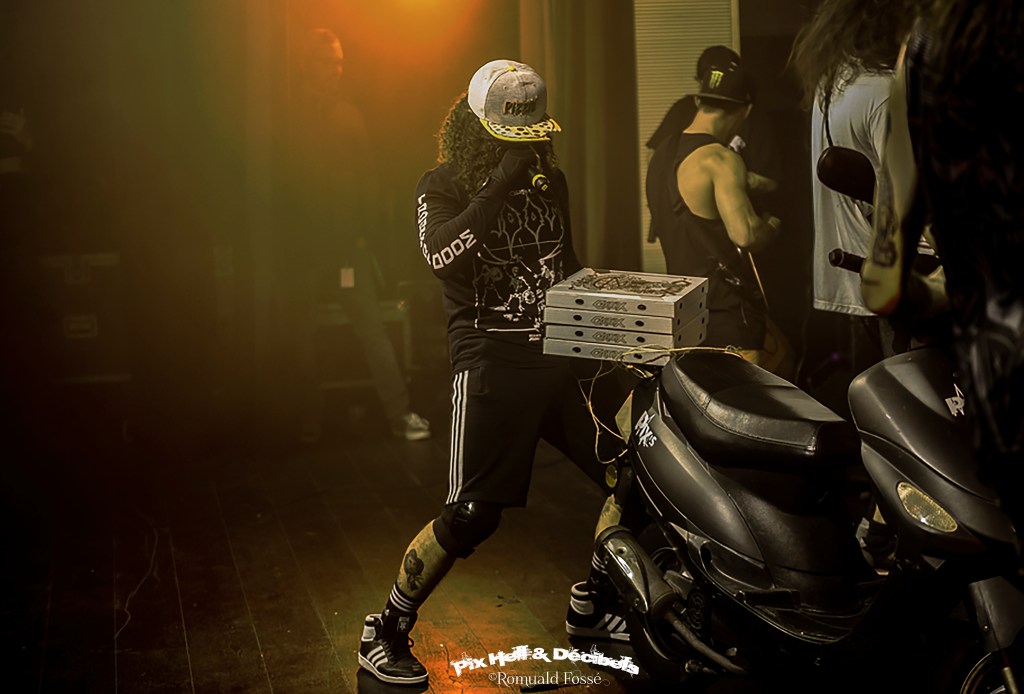 Cette mise en scène, parlons-en. Je me souviens m’être posé plusieurs questions avant le concert : « vont-ils faire comme au Hellfest ? », « Vont-ils nous apporter de la pizza ? Débarquer avec un Scooter ? ». Je m’étais dit que non, n’étant pas prévus sur la programmation et ajoutés au mois d’octobre, je pensais qu’ils auraient joué sans incorporer tous ces éléments. Je vous laisse imaginer ma surprise lorsque le chanteur est arrivé en scooter pour nous livrer de la pizza après leur medley, pour nous interpréter certains morceaux de leur nouvel EP, « No Tip for The Kid », « Raptors in the Kitchen » et leur fameux, si je puis dire, hymne « World Needs Mosh ».