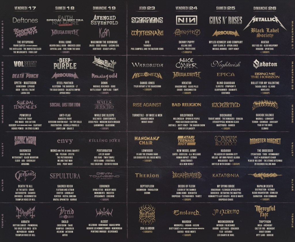 Avec cette double édition, la liste des groupes présents au Hellfest cet été paraît quasi exhaustive ! L’occasion rêvée pour fêter comme il se doit cette 15ème édition du festival. Si on retrouve parmi les têtes d’affiches de nombreux habitués (The Dropkick Murphys, Megadeth, Avenged Sevenfold, Scorpions…), cette nouvelle édition nous réserve aussi de très belles surprises : pour la première fois de son histoire, le Hellfest reçoit Metallica ! On retrouvera aussi les très attendus Guns N’Roses ainsi que Deftones.