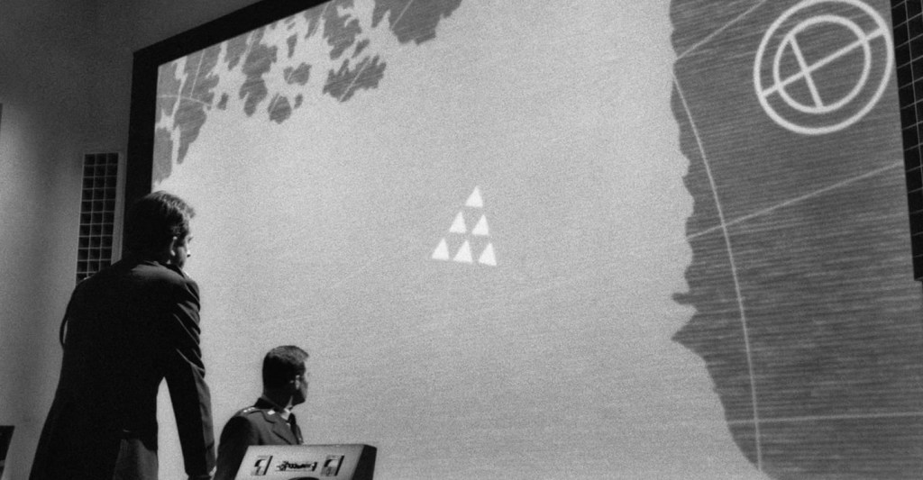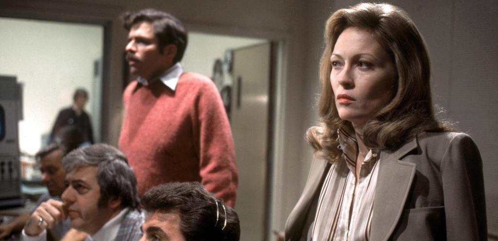 Comme souvent dans le cinéma de Sidney Lumet, Network repose sur la mise en dialectique de l’arrivée d’un événement catastrophique – qui vient soudainement au début du récit – avec une situation, des personnages et des intrigues qui le précèdent ou lui font suite. C’est par exemple, dans Point Limite (1964), la manière dont la perspective imminente et inéluctable d’un cataclysme nucléaire vient figurer le contexte historique et politique de la Guerre froide, conflit mondial et pourtant quasiment invisible. Chez Lumet on entre toujours par la petite porte, par le prisme d’un individu pris dans un système beaucoup trop vaste et complexe pour être représenté avec précision dans son ensemble. L’ancrage physique de ses films se limite d’ailleurs souvent à la petitesse d’un lieu clos : une salle de conseil de guerre pour le président des Etats-Unis (Henry Fonda) dans Point Limite, la banque que braque Sonny Wortzik (Al Pacino) dans Un après-midi de chien (1975), un palais de justice pour nombre de ses films, ou un studio de télévision pour Network. En revanche, les éléments qui assurent une vision globale sont quant à eux souvent de nature schématique et abstraite, à l’instar des planisphères qui ne donnent à voir qu’une succession de lignes et de points numériques dans Point Limite.