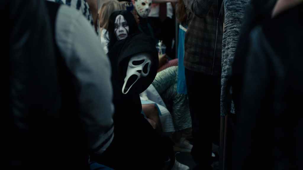 Cet héritage complexe (entre déplacement géographique et esthétique d’une figure, surenchère et paranoïa mettant en crise la communauté représentée) est condensé dans la séquence qui est peut-être la plus mémorable du film. Espérant enfin parvenir à piéger le meurtrier, le groupe d’amis se rend en métro le soir d’Halloween dans un lieu où prendra place la confrontation finale du film. Entassés dans les rames, de nombreux individus sont déguisés, masqués – parmi eux, quelques Ghostface. Les plans coupent rapidement, des champs et contrechamps ne cessent d’avoir lieu entre personnages et meurtriers potentiels – le tueur pouvant être aussi bien la silhouette assise à côté d’eux ou une autre les fixant à quelques mètres. Qui plus est, le fait que les membres du groupe se trouvent dans deux métros différents augmentent la tension déjà présente. En résumé, la séquence, hommage détourné à Jason Takes Manhattan, où Voohrees prenait déjà le métro, est investie d’une dimension paranoïaque qui découle du film de Don Siegel.