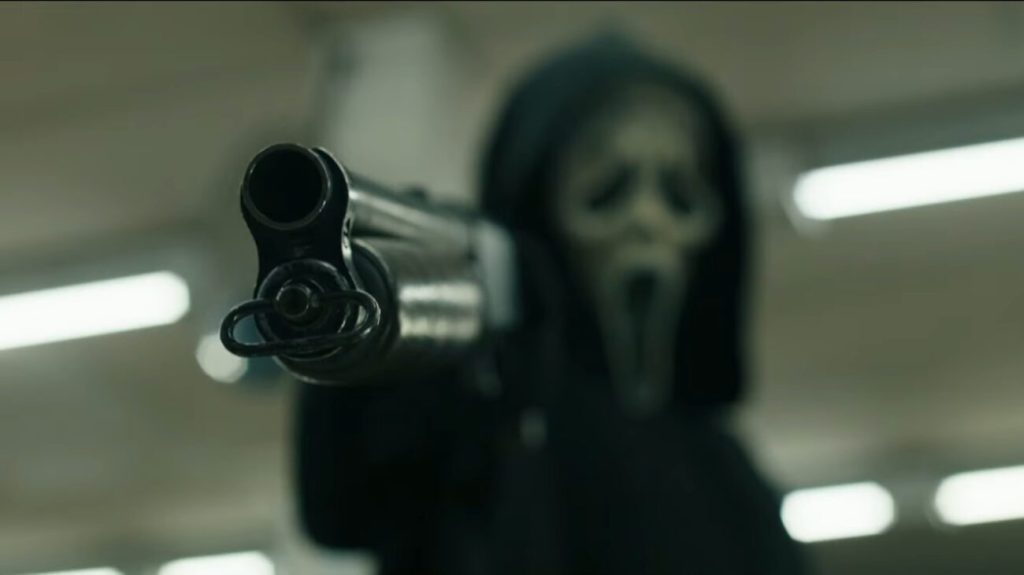 Il n’en faut pas plus pour comprendre le sentiment de fascination qui se dégage de la suite de la séquence. Balayant le restaurant, le plan finit par cadrer une jeune femme assise au bar. Enseignante de cinéma à la faculté – la saga n’a eu de cesse de convoquer des figures de cinéphiles très variées -, elle attend assez nerveusement l’arrivée de son date. L’inconnu l’appelle, prétextant s’être perdu en route, et la convie à le retrouver dans une ruelle. Sans réelle surprise, elle finit par se faire massacrer. Le geste de mise à mort intervient suite à une succession de plans à la mise en scène hautement cravenienne. Tyler Gillett et Matt Bettinelli-Olpin travaillent de nombreux points de fuite conviant les regards vers l’obscurité la plus totale (à l’image du fond de la ruelle où passe furtivement une silhouette) et convoquent des espaces en marge : ici, ce qui ressemble à l’entrée d’un entrepôt plongée dans le noir – autant de hors champs suggérant la présence de Ghostface. La brutalité du meurtre, comme souvent, survient dans une zone non loin de laquelle passent de nombreux individus, à la frontière d’une quotidienneté, au cœur d’un territoire vénéneux où retentissent violemment les coups de poignard et les râles de la victime. Surgissent évidemment les souvenirs du meurtre de Casey (Drew Barrymore) à la fin de l’ouverture du premier Scream, étendue à l’entrée de sa maison, alors que ses parents viennent d’y pénétrer.